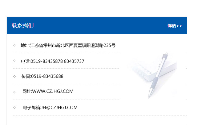 地址:常州市新北區友邦商務大廈1幢16、17層  電話:0519-85101652  傳真:0519-85112595  郵編:213022  網址:www_cz-jiayue_cn.zlfrp.com  郵箱:xiajifengaa@163.com